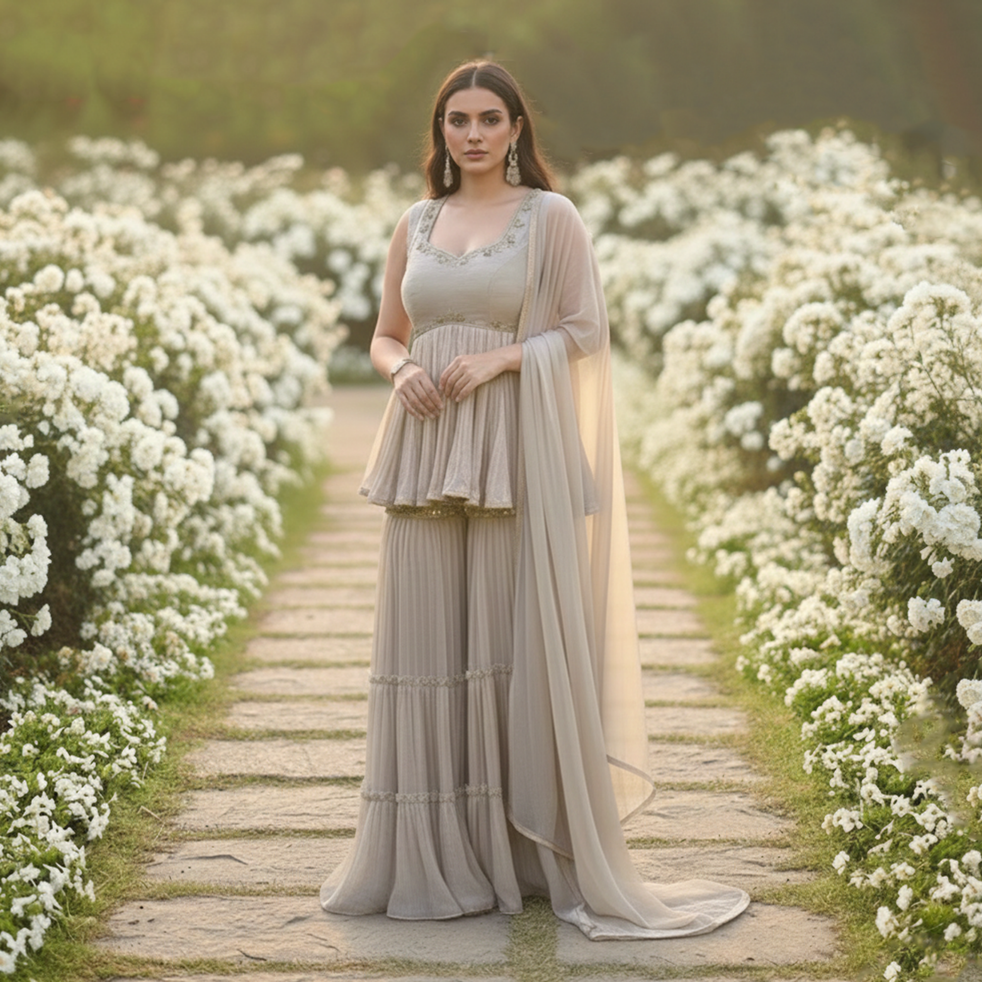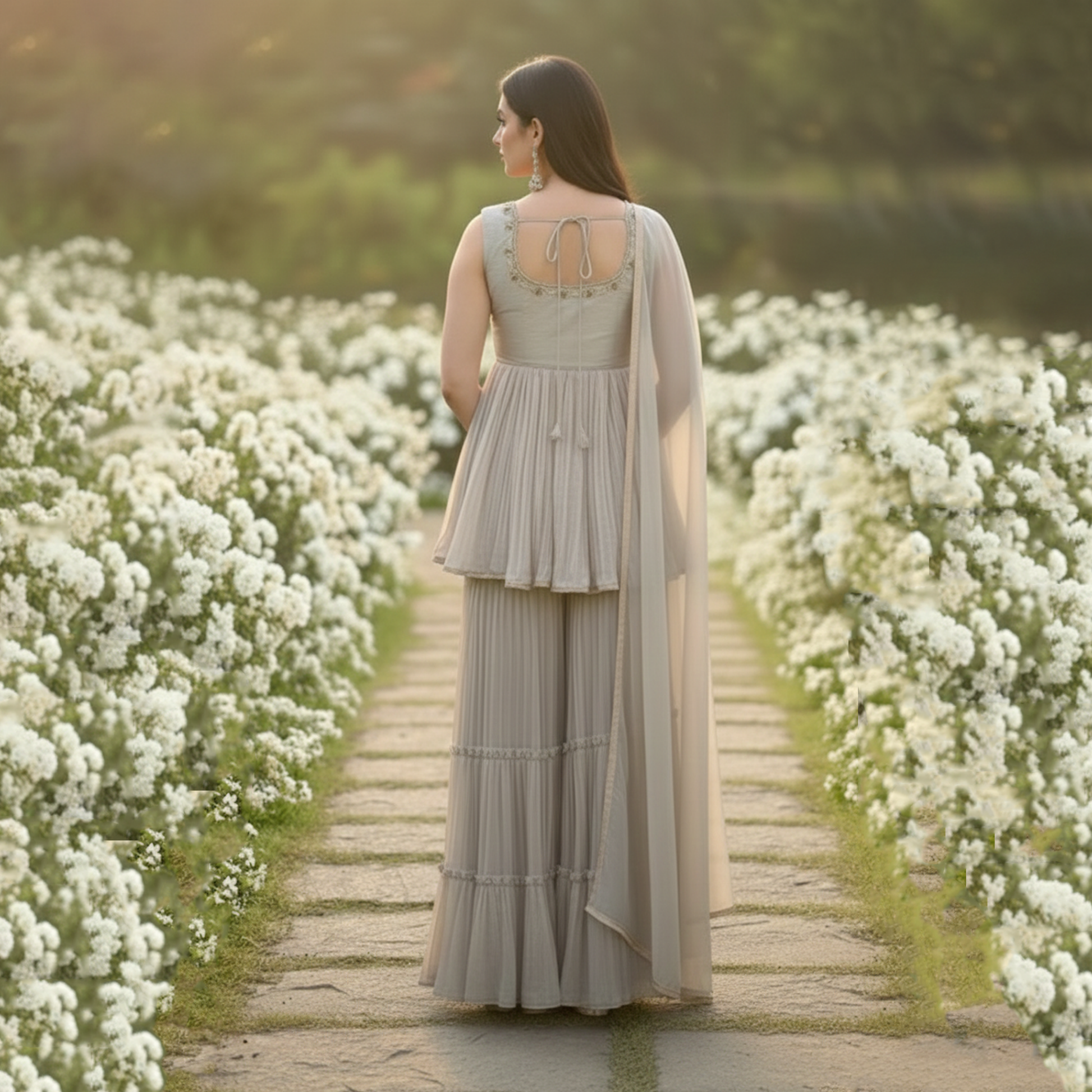 Introducing ‘Haya Sharara Set’ in a soft neutral hue — a blend of contemporary minimalism and artisanal charm. Crafted from light, flow-friendly textured georgette and Raw Silk, the ensemble features a sleeveless, flared kurta with gentle gathers at the waist and subtle tonal hand embroidery along the neckline and waistline. It is paired with tiered, wide-leg sharara pants that add movement, and comes with a matching lightweight dupatta with delicate lace edging. The silhouette is designed to flatter and flow, making it perfect for semi-formal occasions, festive gatherings or intimate celebrations.