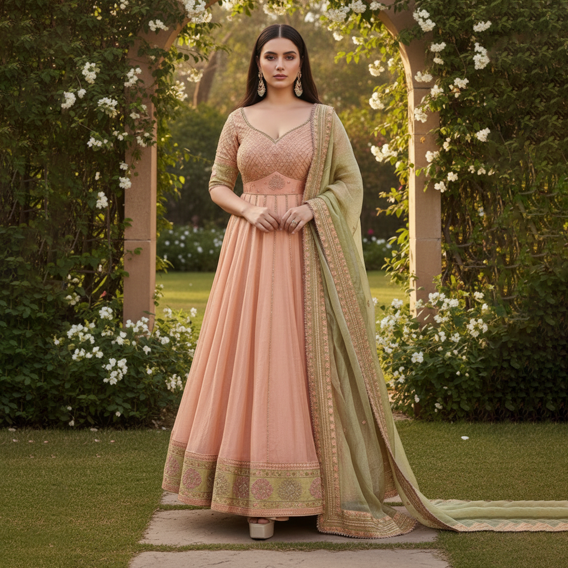 Gracefully handcrafted in delicate shades of peach and olive, Inaayat Kurta Set is a celebration of modern femininity through timeless craftsmanship. The kurta is tailored in soft tissue silk with intricate zari and thread embroidery gracing the bodice and sleeves. The elbow-length sleeves are adorned with detailed latticework and bordered with subtle gold highlights that shimmer beautifully under light. The sweetheart neckline looks flattering, while the deep, scooped back adds a hint of understated allure — perfectly balancing tradition with contemporary elegance. Flowing into a voluminous flare, the silhouette moves effortlessly, lending a regal grace to every step. Paired with an olive dupatta finished with delicate hand embroidered zari borders, the ensemble embodies the spirit of festive sophistication. Rooted in Taro’s philosophy of conscious craftsmanship, Inaayat celebrates pastel tones, handcrafted detailing, and the quiet poetry of simplicity — ideal for intimate gatherings, mehendi brunches, and joyous festive occasions.