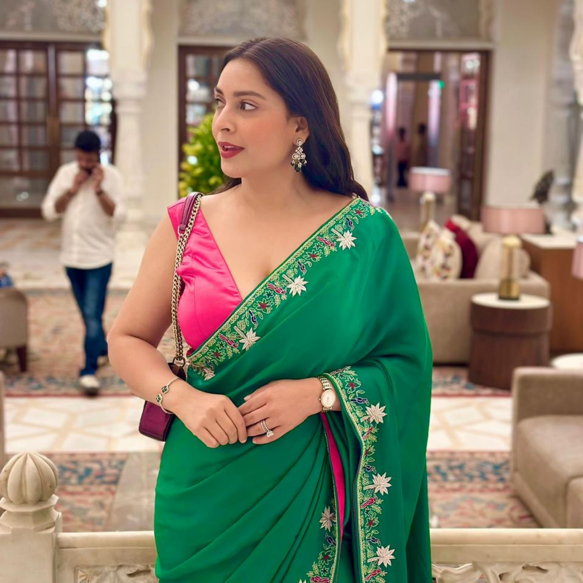 perfectly contrasted by a fuchsia pink blouse, adding a contemporary twist to the